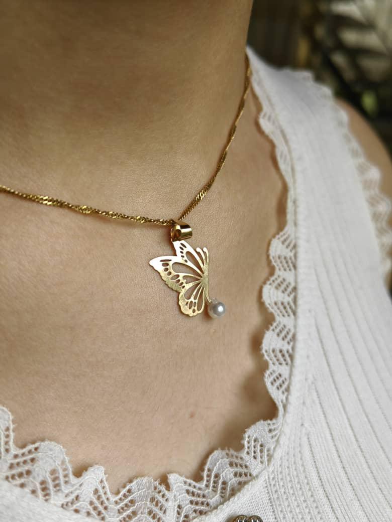 نیم ست طلا18عیار طرح پروانه و مروارید با وزن 1.640 بسیار نمادار و زیبا مناسب خانمهای باسلیقه حتی گزینه ای مناسب برای هدیه